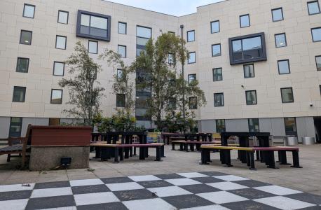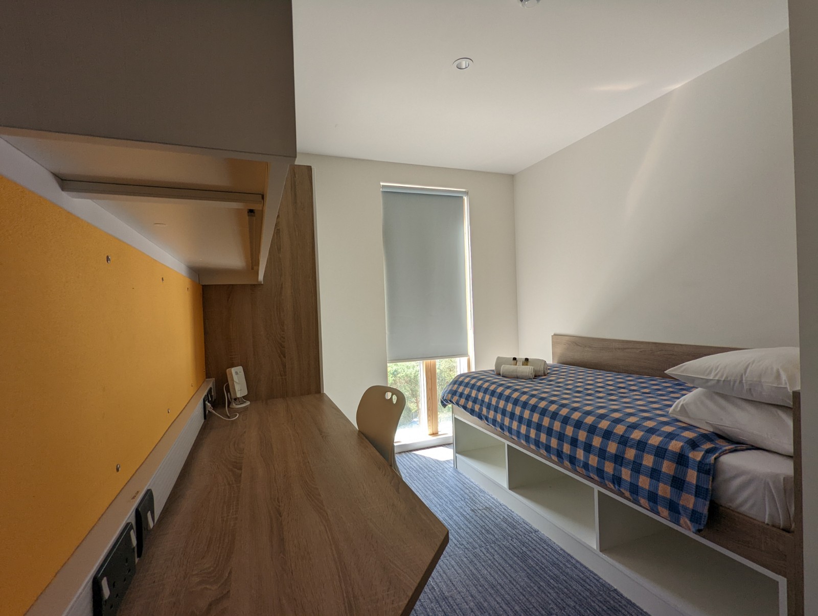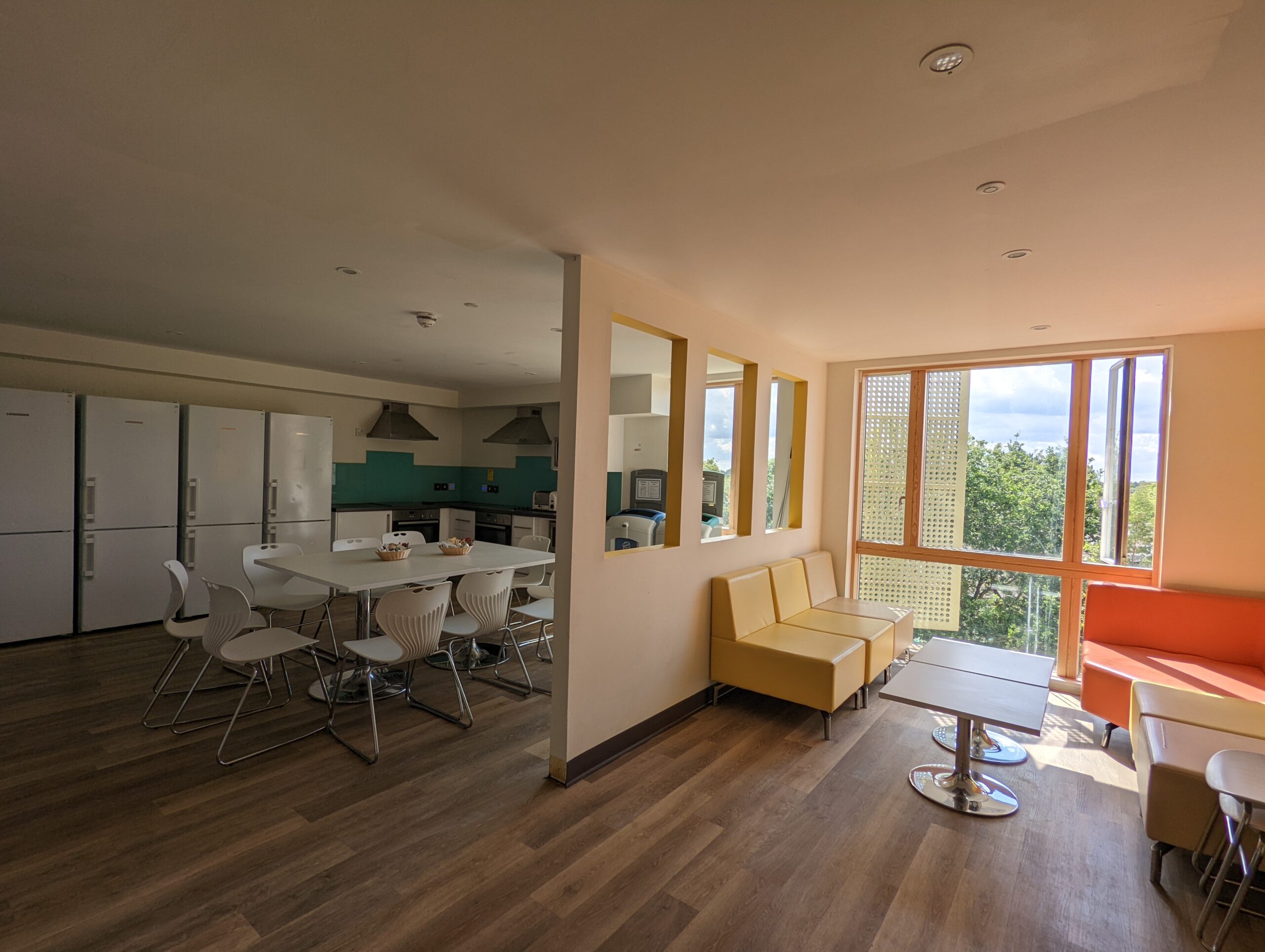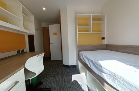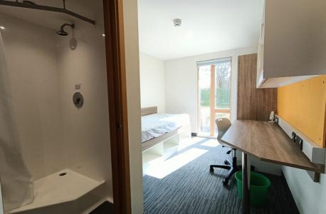 En la moderna residencia del campus de la Universidad de East Anglia, en alojamiento tipo apartamento, en habitación individual con baño privado en régimen de pensión completa.